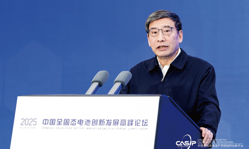 图为全国政协常委、经济委员会副主任,工业和信息化部原部长苗圩在2025中国全固态电池产学研协同创新平台年会暨第二届中国全固态电池创新发展高峰论坛上致辞。中国全固态电池产学研协同创新平台/供图
